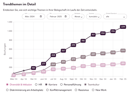 In Ihrem personalisierten Unternehmens-Dashboard finden Sie alle wichtigen Daten und Einblicke zum Nutzungsverhalten Ihrer Mitarbeitenden.