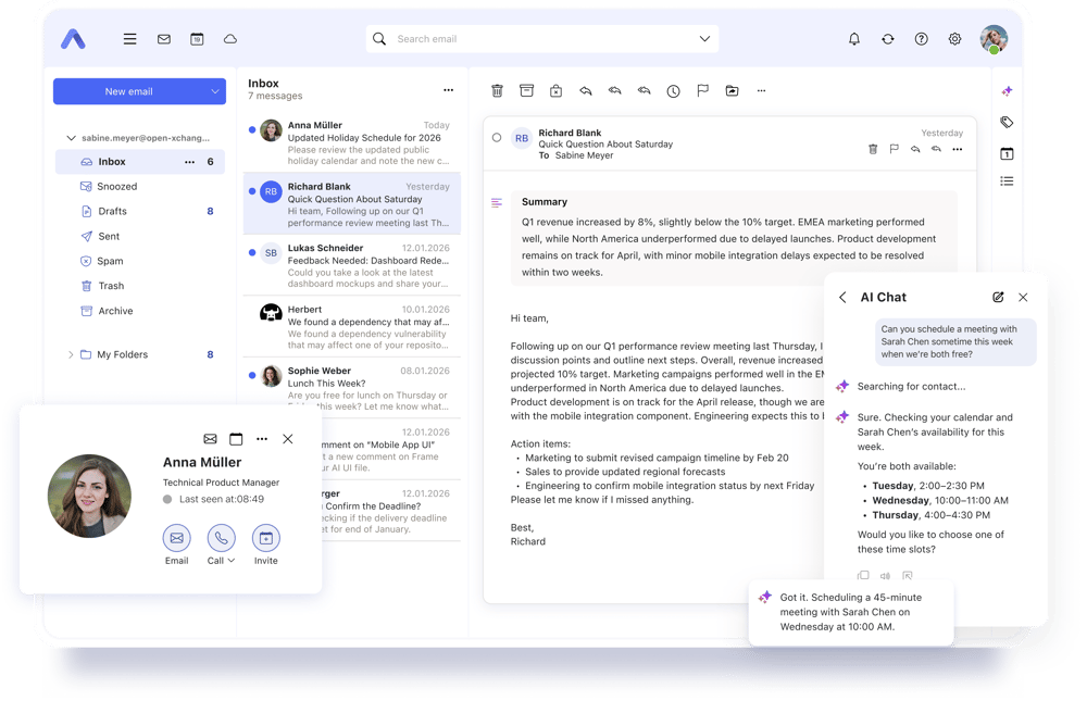 OX App Suite includes an integrated AI agent that works directly inside email and calendar, helping users get more done, without switching tools or losing control.