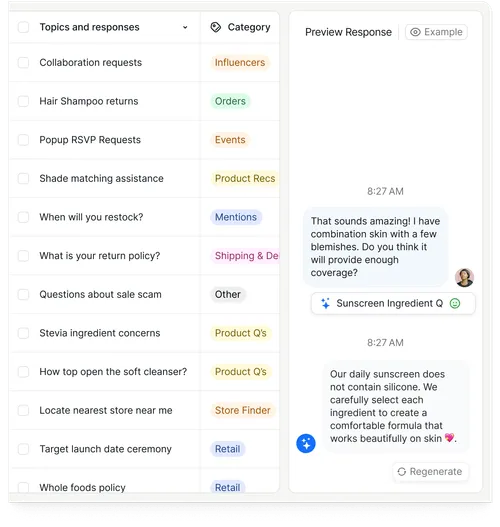 Automatically aggregate and categorize community chatter into insights, complaints, collab requests, influencer asks, and more. Surface top-of-funnel trends and route issues 2× faster, all from one dashboard.
