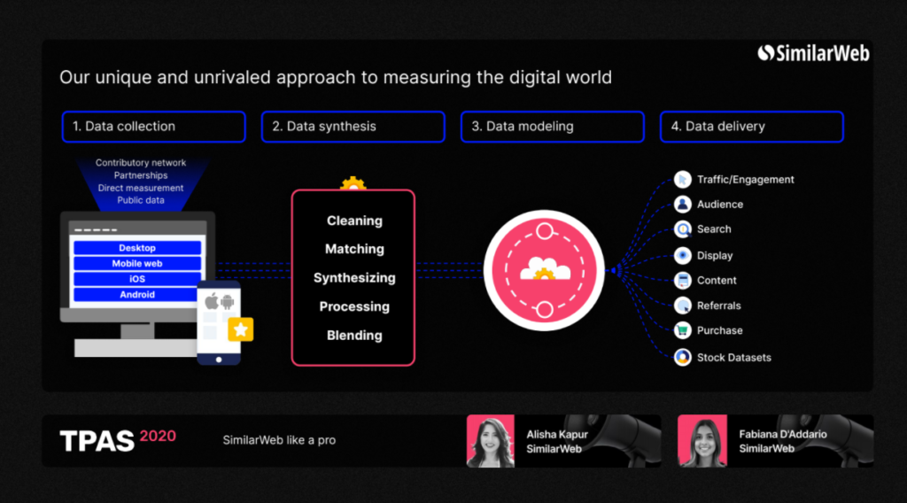 SimilarWeb is a market intelligence platform that provides analytics insights for businesses. Today, it covers 58 different country markets. In the screen below, you can see SimilarWeb’s approach to collecting and analyzing digital data.