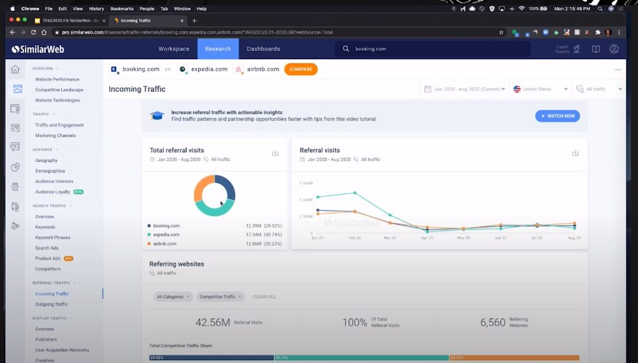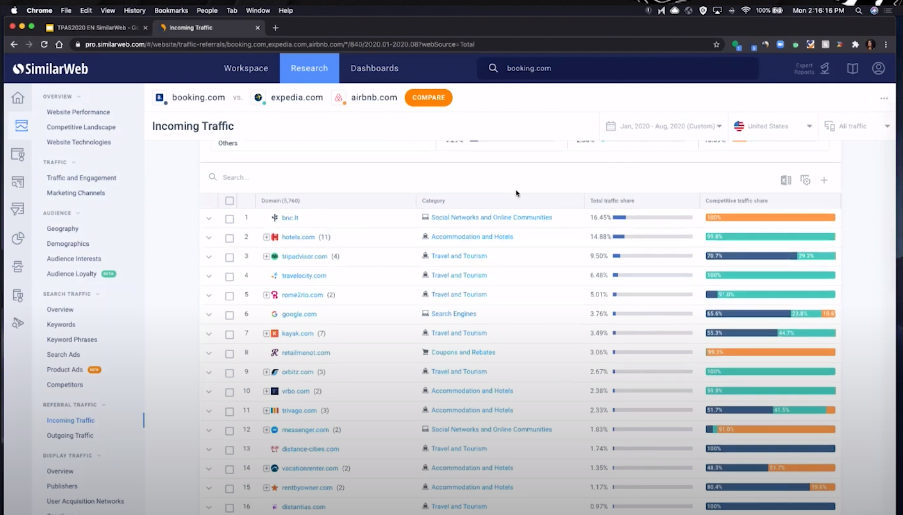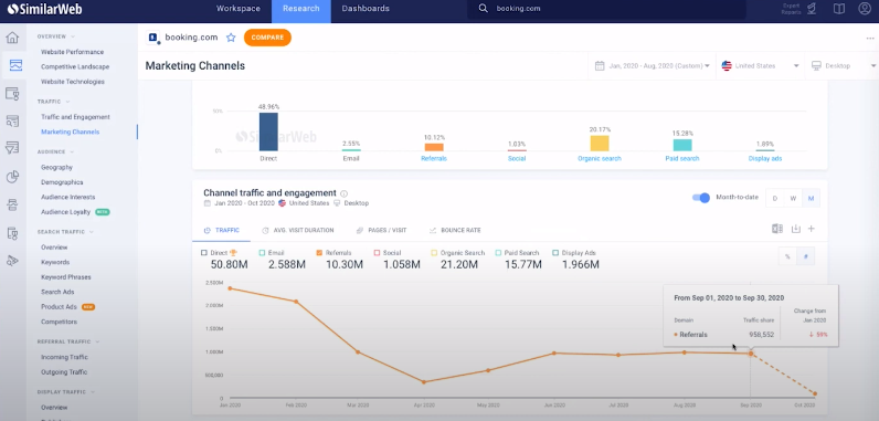 SimilarWeb Pro is a widely used platform that gives comprehensive analysis for any site or application on the internet. Fabiana gives an example [5:49] of how you can use SimilarWeb Pro to run web traffic analysis in the case of Booking.com, one of key players in the travel niche. The first indicator to check is marketing channels.