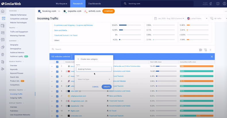 SimilarWeb offers a lot of ways to discover new affiliate opportunities. In the “Referring websites” section, click “Competitive Traffic” and then “Referral Opportunities” and there you can see all the referrals that are sending traffic to your competitors and not you. Basically, these are potential partners who you can reach out to, and SimilarWeb allows you to add such domains to one partner list, which you can monitor over time. What’s more, the feature of category distribution helps categorize competitors’ traffic, and there are over 170 categories to filter to.