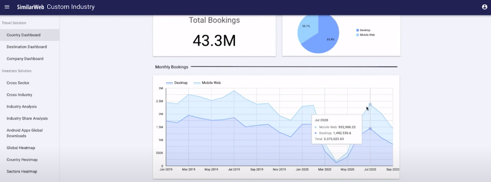 Travel Intelligence is SimilarWeb’s most granular dataset on the transactional performance of the OTA accommodations and hotel sector. You can monitor total booking volume and market share by company across 56 countries. It’s a great way to identify: