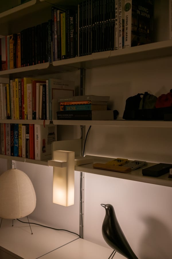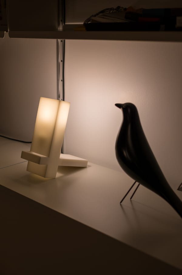 A lamp that can be used in several ways. As an ambient lamp where the lights reflects against the wall or the desk. Or as a shelf lamp to light up a specific environment.
