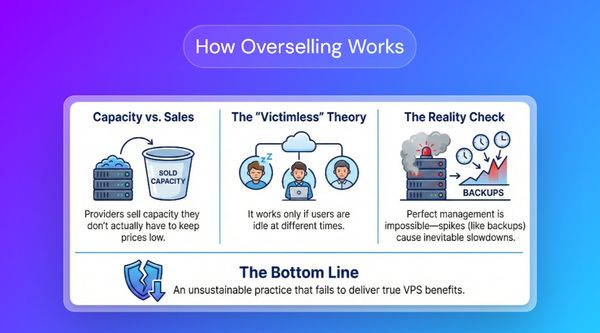 Overselling is when a provider sells more VPS hardware capacity than they actually have. To give a simple example, a provider might have 128 GB of RAM available but sell 256 GB to customers, betting that they won't all use it at the same time.