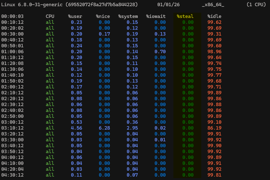 In Linux, this waiting period is measured as Steal Time (%st). It can have a major impact on your application's responsiveness, regardless of how powerful the CPU is on paper. A steal time above 0.0% means that the host is forcing your application to pause while it waits for others to complete their computation. The higher the percentage, the more lag it's going to cause.