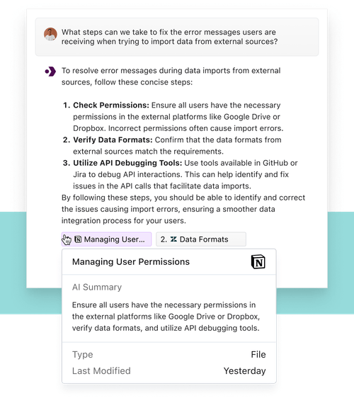 Enable fast and accurate responses to customers by empowering support reps with quick access to information buried in historical tickets, support docs, and product wikis.