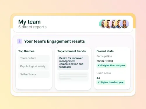 View trends for your team based on survey data, one-on-ones, and Updates, and get recommendations to improve team participation and reduce attrition.