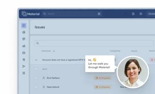 Material fits seamlessly into your team’s workflows and is fully extensible via APIs and event hooks. It protects users without getting in their way. Trade reactive scrambles for proactive security, and trust that Material is always in the background.