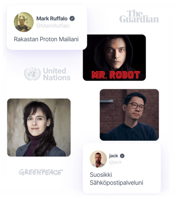Niin uutistoimitukset, aktivistit ja kansainväliset järjestöt kuin tutkijat, nobelistit ja elokuvatähdetkin luottavat Proton Mailiin, joka takaa viestinnän turvallisuuden ja yksityisyyden. Käyttäjiä on jo yli 100 miljoonaa ympäri maailman – liity nyt joukkoon, jonka mielestä yksityisyys kannattaa suojata verkossa.